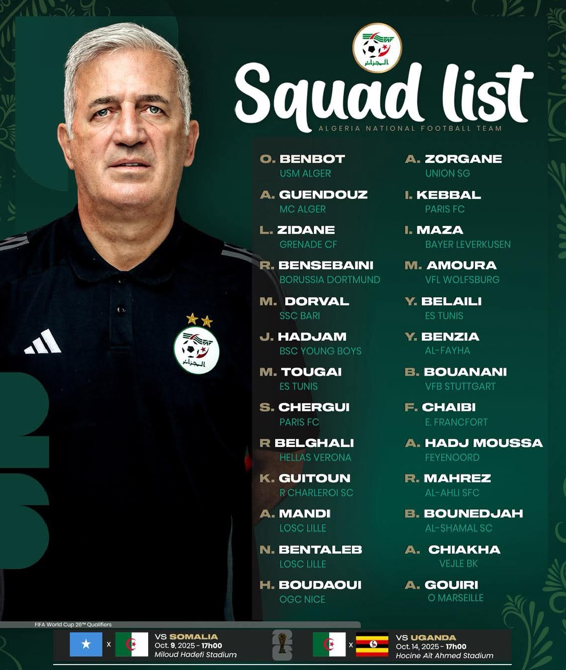 أعلن فلاديمير بيتكوفيتش مدرب المنتخب الأول الجزائري لكرة القدم عن قائمة اللاعبين المدعويين لمقابلتي الصومال وأوغندا المبرمجتين على التوالي يومي 9 أكتوبر الجاري في ملعب ميلود هادفي بوهران و يوم 14 أكتوبر في ملعب حسين آيت أحمد بتيزي وزو في إطار الجولتين التاسعة والعاشرة من تصفيات مونديال 2026.